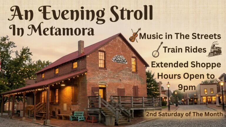 Dates: Second Saturday of each month (May – October 2026) | Time: Evening until 9:00 PM | Location: Downtown Metamora
